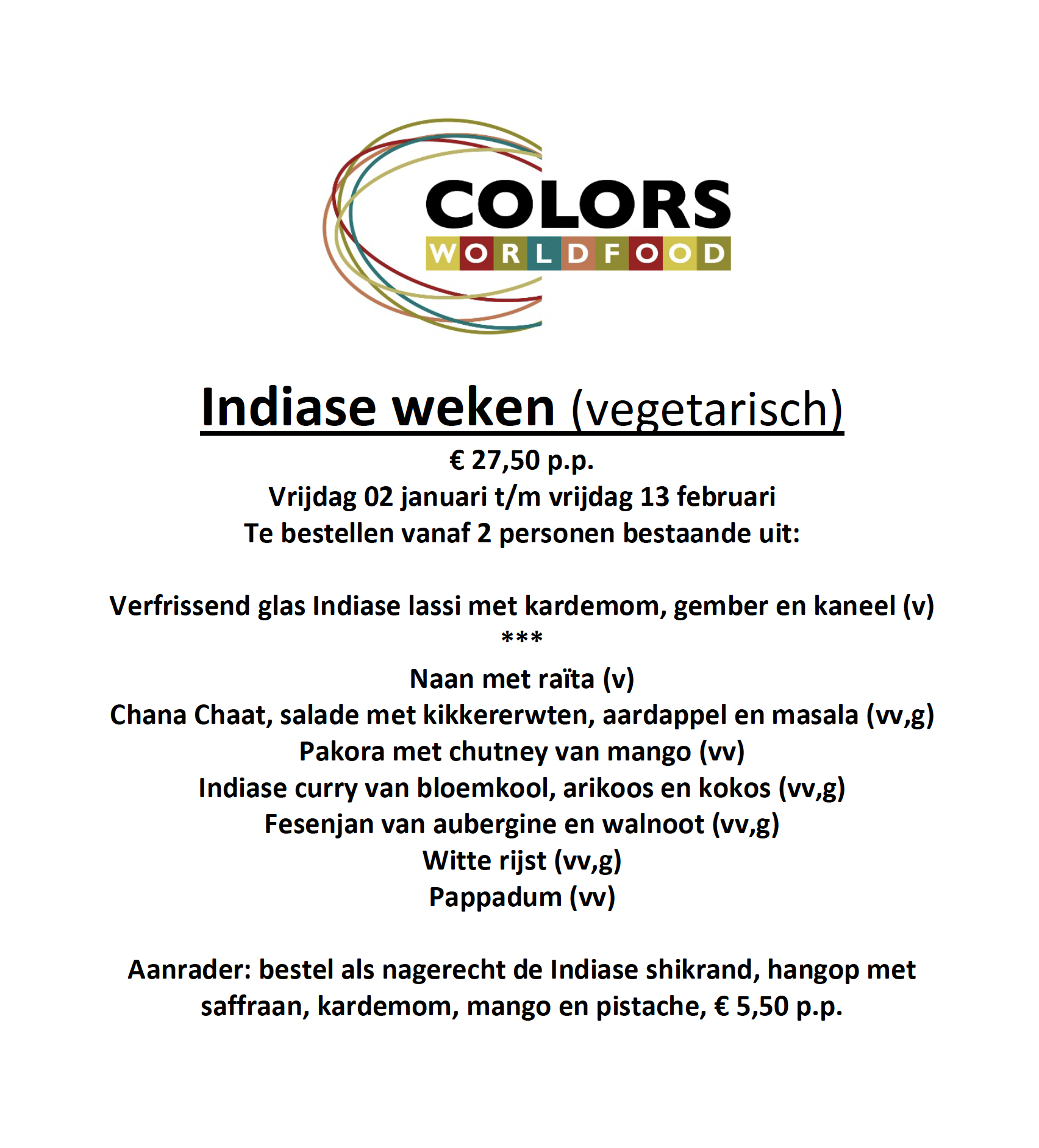 Met ingang van januari 2024, serveren wij geen themamenu's meer. Wij hebben vanaf nu de 2 bovenstaande Colors menu's.
